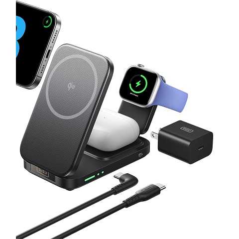 Sale $16.39 Reg.( $44.99 )Amazon – INIU 3 in 1 Wireless Charging Station, Qi2 Certified 15W Travel Charger for Apple Multiple Devices, Foldable Charger Stand for iPhone 17 16 15 14 13 12 Series Apple Watch AirPods (with Adapter)