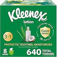 8 boxes of Kleenex Lotion 3-Ply Facial Tissues with Coconut Oil & Aloe, 80 tissues per box (640 tissues total) BE PREPARED FOR SICK DAYS — We know we can’t prevent sick days, but Kleenex can help you through them by moisturizing your skin to help prevent skin irritation