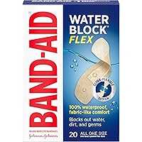 20-count box of 100% waterproof Band-Aid Brand Water Block Flex Adhesive Bandages all in one size to cover minor cuts, scrapes & wounds and block out water, dirt, and germs that may cause infection.